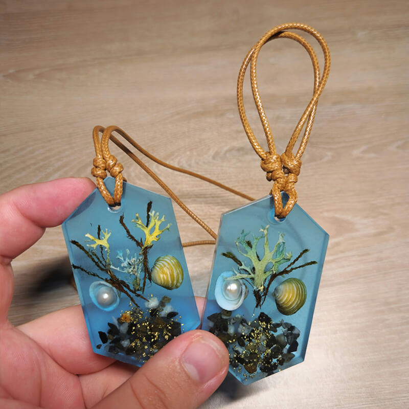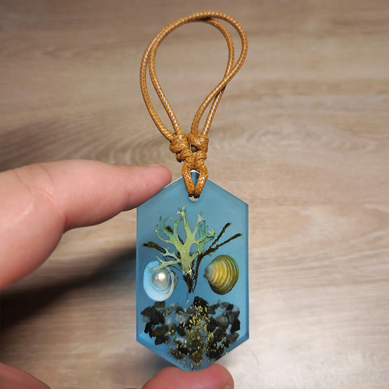 Modèle Hexagon Fait Main Collier Et Porte-Clés Époxy Lueur Unique Or Pur 24K Perle Véritable Collection « Océan Doré »